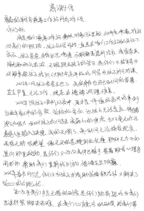 班级中结交了真诚的朋友,甚至凭借在社区活动中展现的负责与热忱,成功竞选了班级生活委员的职务。母亲含泪感慨:“那个爱说爱笑的孩子,好像真的回来了。”服务对象的母亲十分感谢困服所这些日子的帮助连自己都想放弃的时候是困服所重新照亮了他们的家庭,为此其母亲张阿姨真挚的为困服所写了一封感谢信,一并送来锦旗,金灿灿的字是对困服所工作的肯定,亲切的笔记则是映射出其对社工深切关怀、理解与由衷嘉许。
