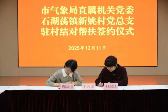 会上,市气象局直属机关党委与松江区石湖荡镇新姚村党总支签订《城乡党组织结对帮扶工作协议书》。根据协议,双方将以党建联建为纽带,精准对接资源优势与发展需求,在气象服务提质、民生保障升级、集体经济增收等方面开展深度合作,携手谱写乡村振兴崭新篇章。