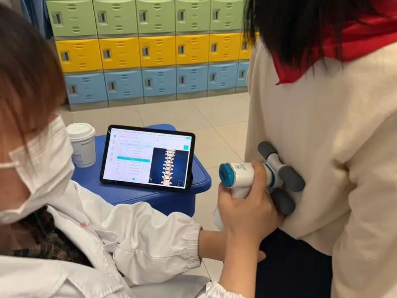 筛查现场,学生们挺直后背、双脚分开站立,医生手持脊柱三维测量仪沿脊柱轻轻扫描。短短几秒钟,仪器屏幕便生成出一张脊柱三维形态图,并实时显示曲度数据。对于检测结果异常的学生,医生会立即使用脊柱测量尺进行复测。