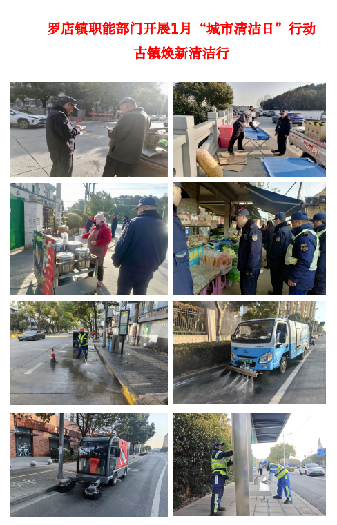 罗店镇开展“古镇焕新清洁行”城市清洁日行动。月罗环卫作业队伍对罗升路、罗太路、塘西街、东西巷街等重点道路和区域进行冲洗和深度清洁作业。古镇公司对城市更新施工区域进行保洁。综合执法队指导门责单位做好跨门经营等市容管理。市场监管所指导餐饮企业做好环境卫生、餐厨油脂管理工作。针对沿街商户,开展全域门责宣传,发放垃圾分类宣传单页并清除马路“小广告”。