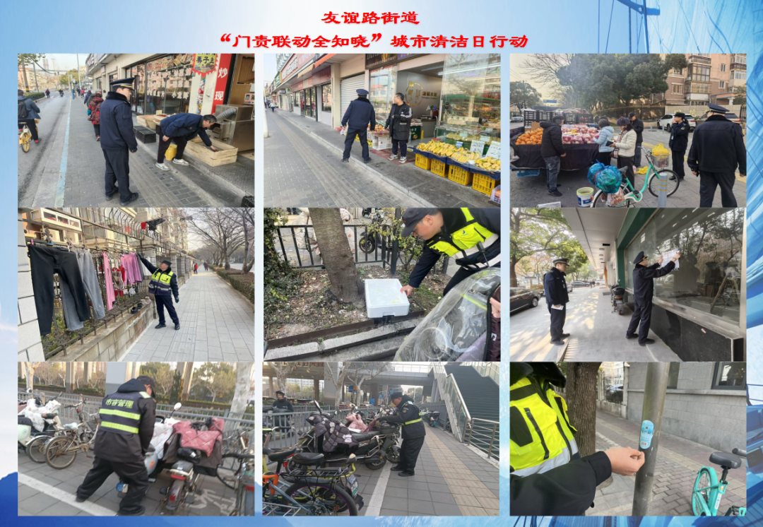 大场镇围绕各重点小区及文明实践站、全域门责重点街区、菜市场周边,组织开展“门责联动全知晓”城市清洁日行动。各重点社区积极发动志愿者,重点推进小区环境清整、小包垃圾、干湿垃圾整治;镇综合行政执法中队同步启动,对区域内的菜场周边,外摆位置等区域开展深度清洁和专项整治;环卫工作人员则对重点道路进行深度清洁作业。