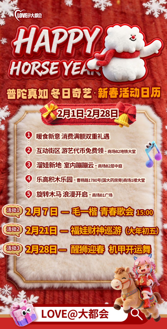 LOVE大都会同步推出暖食新意消费满额双重礼遇,B2层中庭的室内蹦蹦云、1楼大堂的乐高积木乐园和B1广场启浪漫旋转木马为亲子家庭带来丰富玩乐选择,B2地铁大堂还将免费派发互动街区游艺代币,期待市民沉浸式体验美食福利、亲子休闲与互动乐趣等。