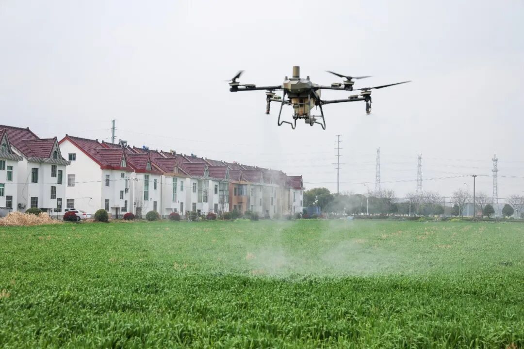 3月23日清晨,在朱泾镇的麦田里,农户老孙正操作无人机进行飞防作业。为应对清明前后可能出现的多雨天气,合作社已提前疏通并加宽了田间排水沟,同时结合此次飞防增施了叶面肥,促进麦苗由弱转壮。