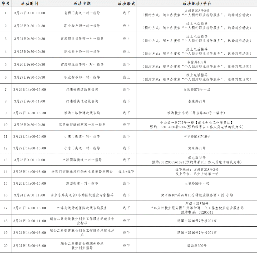 “15分钟就业服务圈”社区就业服务站点建设市政府实事项目作为人社部门常态化政府开放活动之一,我们将持续发布精彩服务内容,今天为大家带来黄浦区、长宁区、静安区、普陀区、崇明区、杨浦区、闵行区、金山区、青浦区近期就业活动安排!