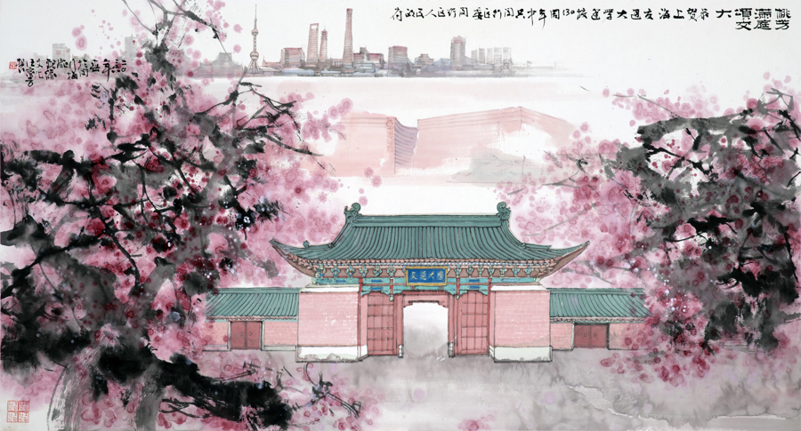 《桃芳满庭颂交大》由中国美术家协会理事、一级美术师汪家芳创作,整幅画心尺寸达180×97厘米。作品以传统中国画为载体,巧妙地将上海交大标志性校门、盛放桃花、大零号湾科创地标与上海城市天际线融为一体,既镌刻着百年学府的深厚底蕴,也勾勒出城区蓬勃向上的时代气象,实现了历史厚重感与时代鲜活感的完美交融。