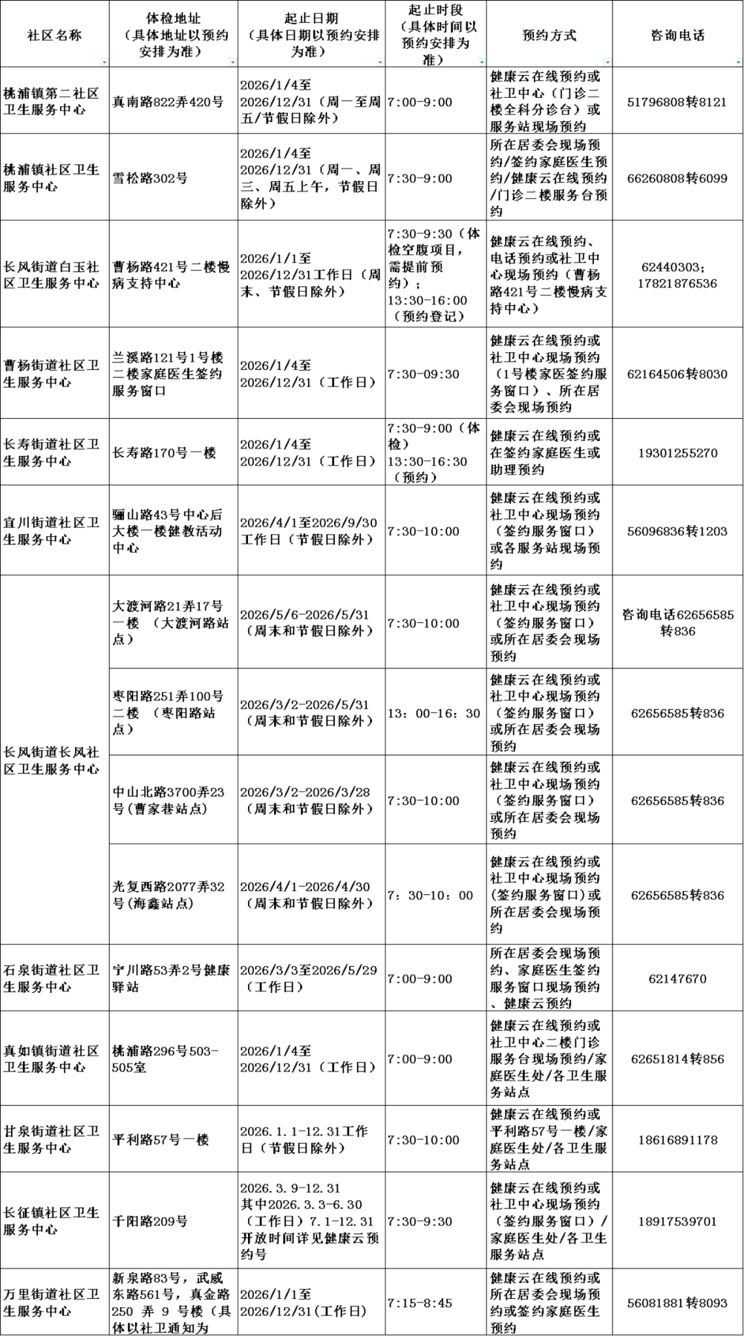 2026年上海市老年人健康体检信息一览表